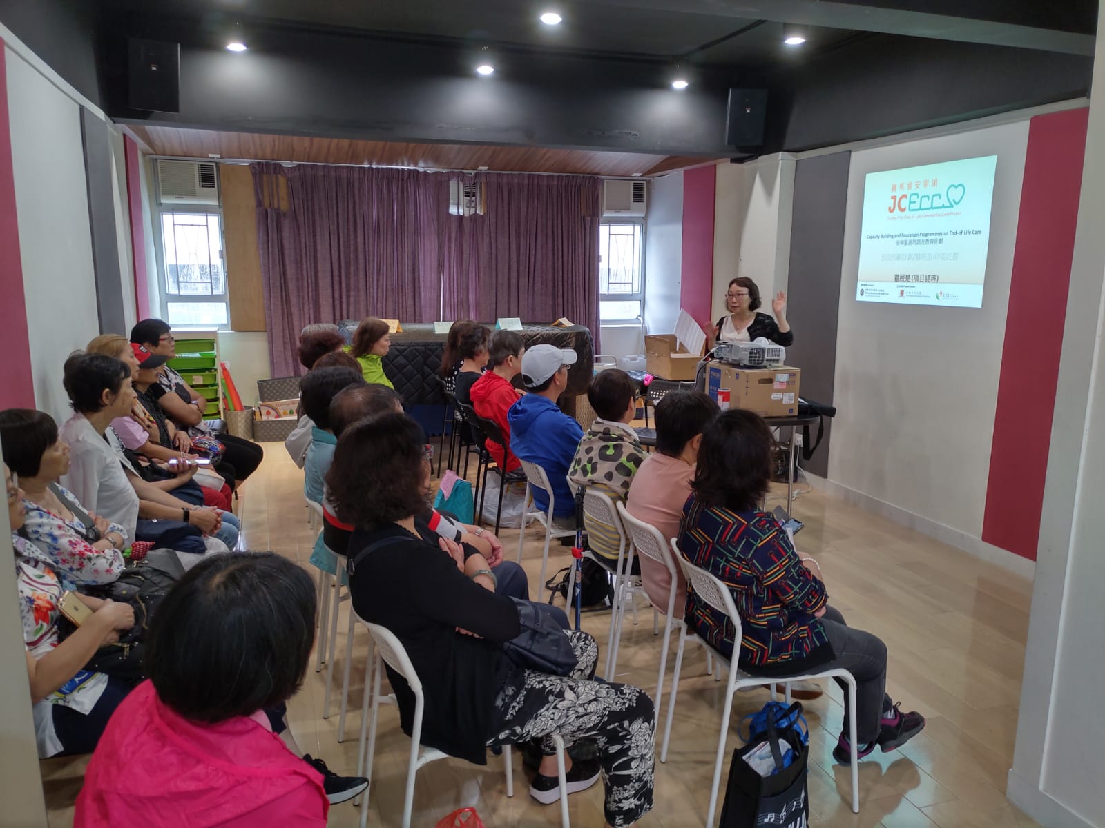 In collaboration with various residential care homes and community centres, the project delivers talks and information sessions to older people and caregivers on a regular basis. To take into account the relatively limited cognitive capacity of the participants and thus ensure their comprehension and retention of information, these sessions make a substantial use of various materials and videos produced under the project (see Resources for more details). Topics covered in the talks include, in addition to those already highlighted in Public Education, bereavement counselling, emotional support, and funeral issues.