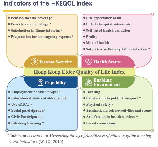The HKEQQL Index enables the trend analysis of the social and economic well-being of older people annually, identification of locally important determinants of well-being among Hong Kong older adults, as well as monitoring and evaluating local age-friendly initiatives.