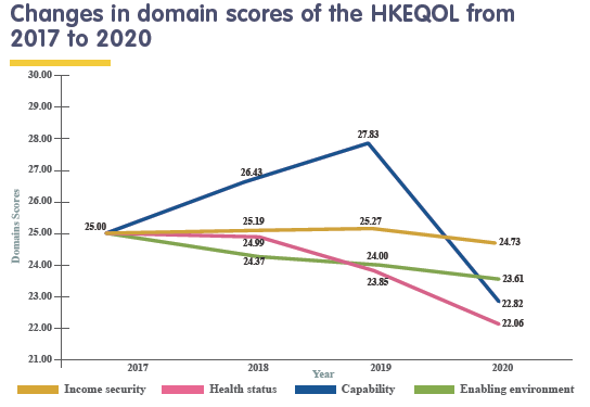 This index was then used to monitor the progress of the territory-wide AFC project. Although positive changes were initially observed, the impact of the 2019 social unrest in Hong Kong, followed by the COVID-19 pandemic, overshadowed these improvements (Woo, Leung, Yu, Lee, & Wong, 2021). The documentation of the trend in HKEQOL shows that while it may be used as a macro indicator that is able to reflect policies affecting the well-being of older people, it is also able to reflect the impact of societal unrest and pandemics, and that the latter may override the effect of existing ageing policies.